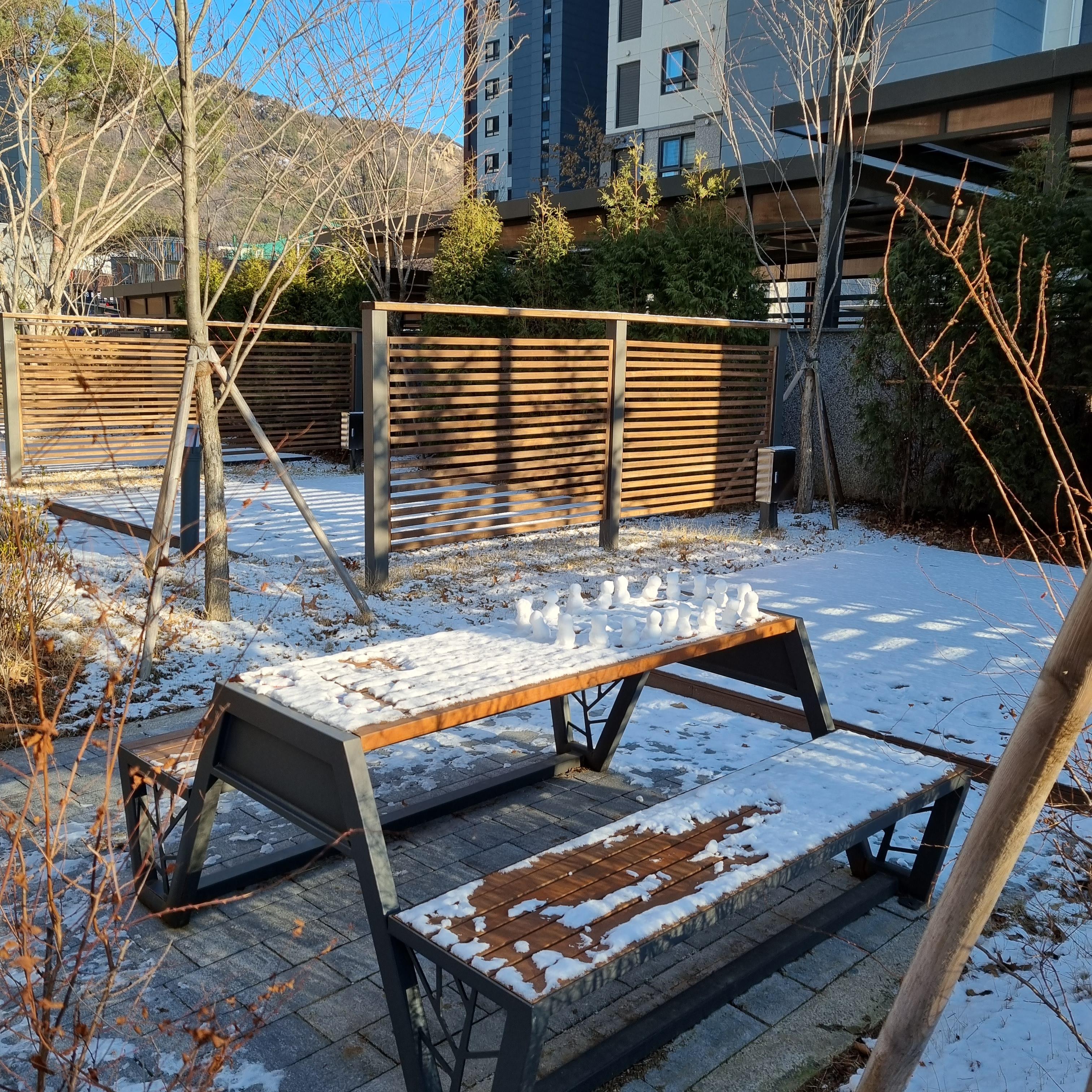 단지 내 캠핑장? 벤치위에 있는 눈오리들